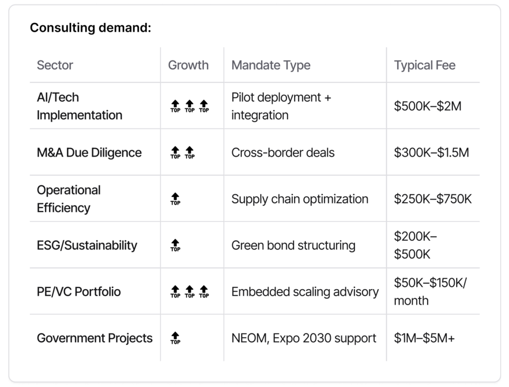 • Government-backed entities are hungry for capability building — NEOM, Qiddiya, Red Sea all need consultants who can train Saudi teams while delivering. This is where “training embedded in execution” becomes a premium service line.